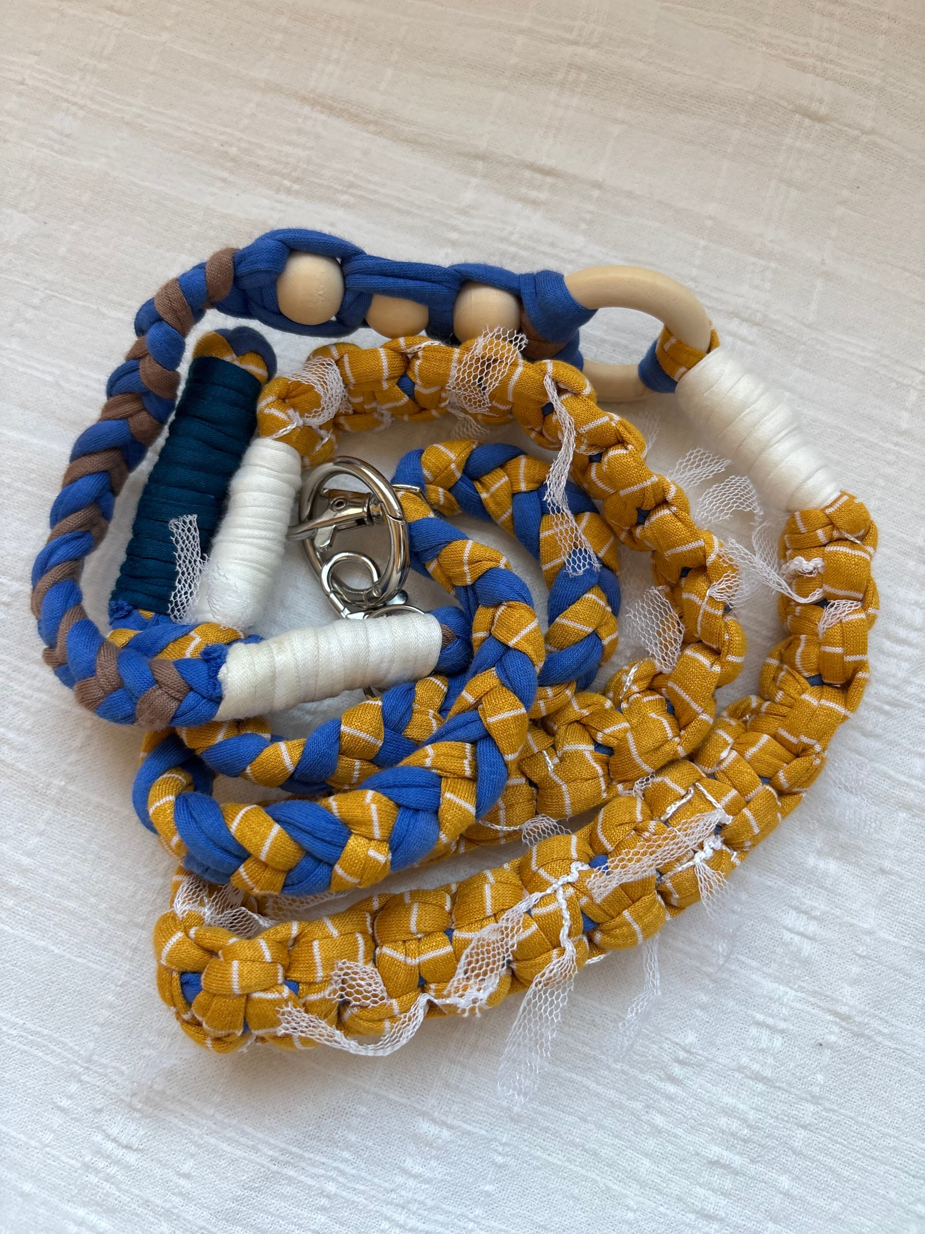 こちらはマスタードのようなイエローと爽やかなブルーをメインに、ホワイトのチュールヤーンを一緒に編み込み、甘辛MIX &POPなイメージに仕上げました♪