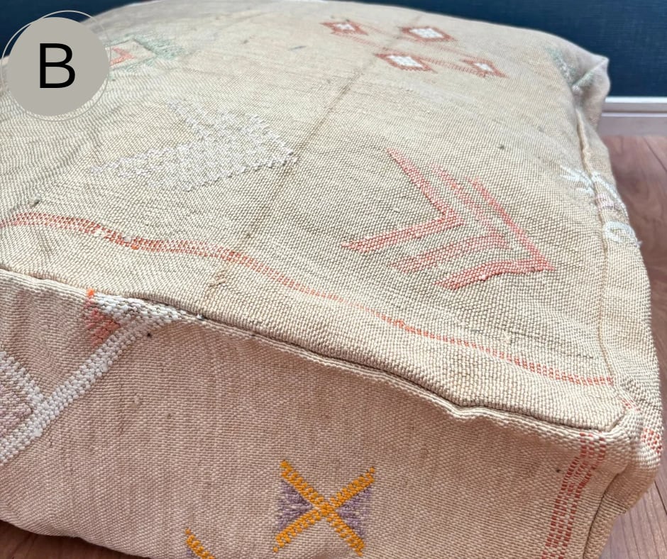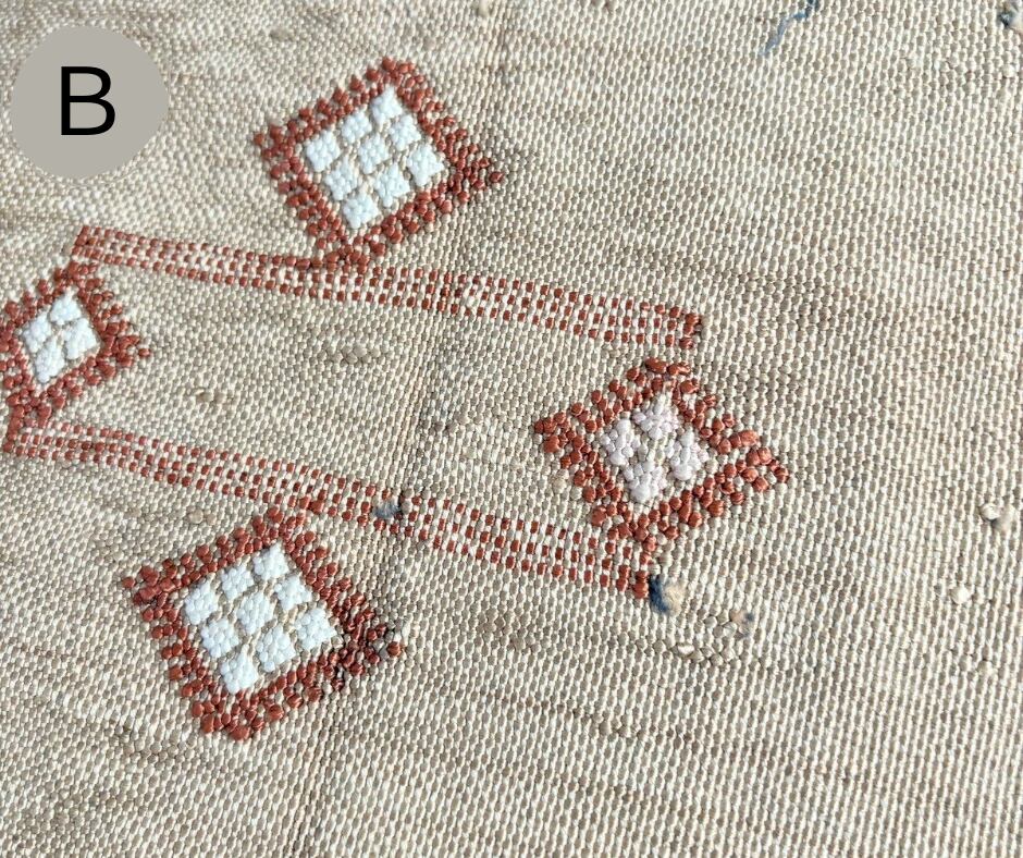 モロッコの職人が一点ずつ作った手仕事の品なので、色むらや織りむらがあるのは通常商品に起こりうることですが、こちらは表面の目立つ箇所に色筋が入っているので、お値下げしております。